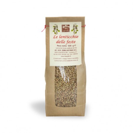 Tempo di Cottura: Tradizionale: 20/30 min. In pentola a pressione 7/10 min. Il loro nome botanico "Lens" deriva dalla forma a lente del seme. Pianta di antichissima coltura, le lenticchie sono state consumate da sempre, grazie anche alla loro facile reperibilità, all'alta conservabilità e al loro basso costo. Viene considerato di buon auspicio consumare un piatto di lenticchie durante la cena dell'ultimo dell'anno quando si uniscono allo zampone e soprattutto per il valore scaramantico attribuito: ciò è dovuto all'antica usanza di regalare, a fine anno, una scarsella (la tipica borsa per conservare monete) colma di lenticchie. L'augurio era che ciascun chicco si trasformasse in moneta, rendendo così ricco e fortunato il destinatario del dono. Le lenticchie sono caratterizzate da un alto contenuto proteico, una buona quantità di zuccheri e una scarsa quantità di grassi. Sono inoltre ricche di vitamine, sali minerali e fibre, in particolare fosforo e potassio. Le lenticchie sono un cibo adatto alla prevenzione dell'arteriosclerosi poiché i pochi grassi in esse contenuti sono di tipo insaturo. Ricche di ferro aiutano chi ha problemi di anemia o di esaurimento fisico. Dal punto di vista nutrizionale, 100 grammi di lenticchie equivalgono a circa 215 grammi di carne. Le lenticchie sono consumate come zuppe, passati, o contorni. Sono tra i legumi a più veloce cottura e non necessitano di ammollo preventivo.